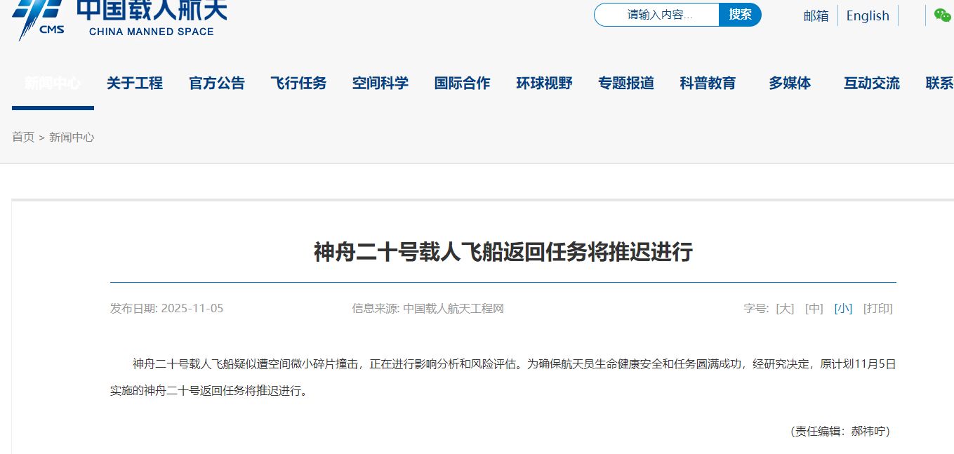 11月14日,推迟返程的“神二十”(即神舟二十号)乘组平安归来。