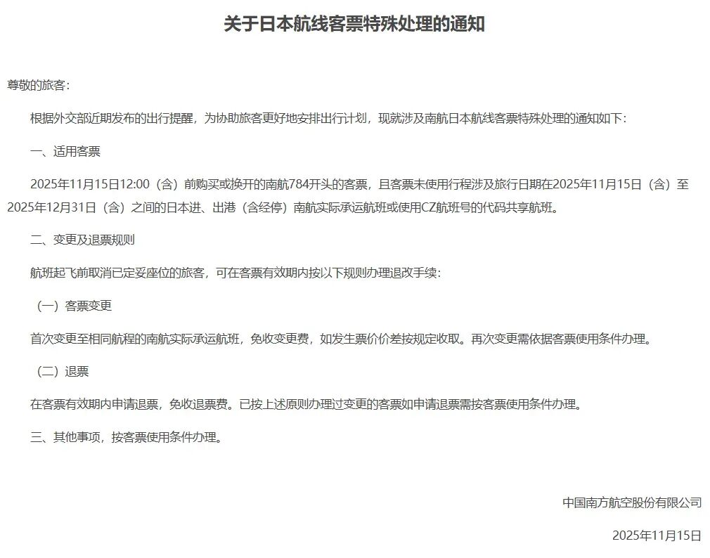 11月15日,中国南方航空股份有限公司、中国国际航空股份有限公司和中国东方航空股份有限公司在官网分别发布了“关于日本航线客票特殊处理的通知”。