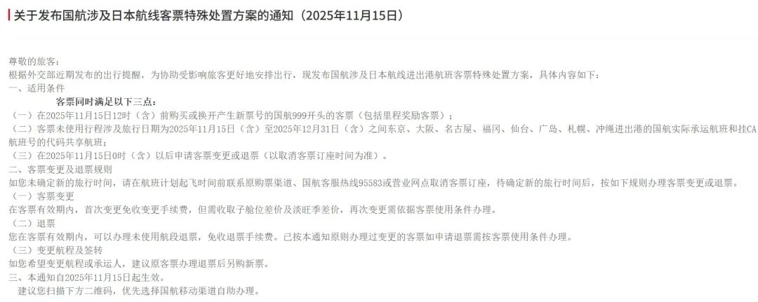 根据外交部近期发布的出行提醒,为协助受影响旅客更好地安排出行,现发布国航涉及日本航线进出港航班客票特殊处置方案,具体内容如下: