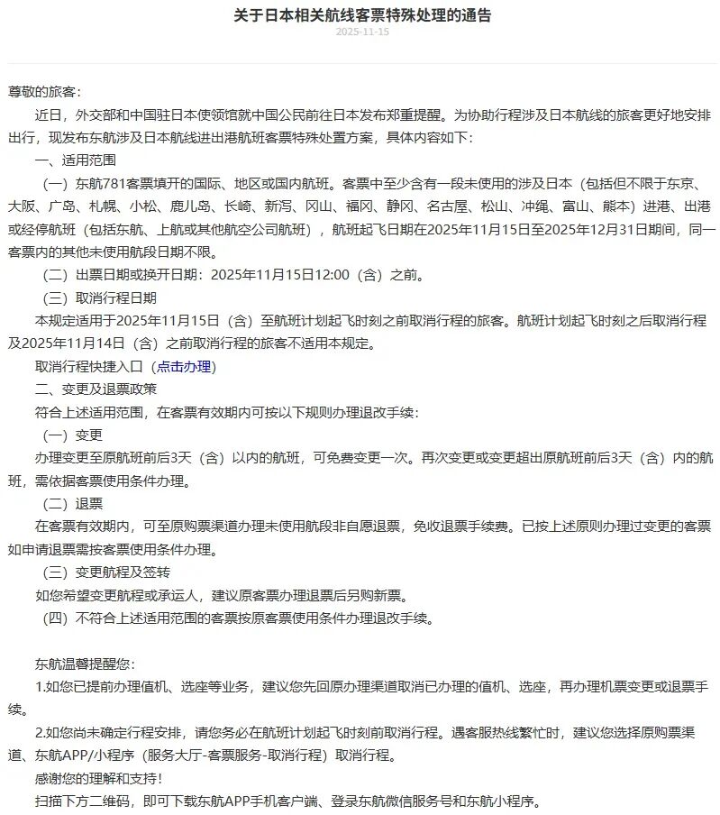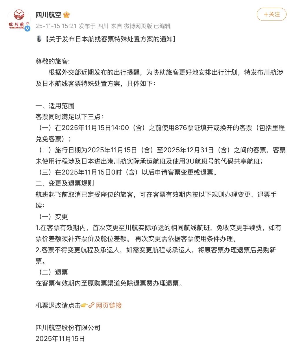 通知中明确,在2025年11月15日14:00(含)之前使用876票证填开或换开的客票(包括里程兑免客票);旅行日期为2025年11月15日(含)至2025年12月31日(含)之间的客票,客票未使用行程涉及日本进出港川航实际承运航班及使用3U航班号的代码共享航班;在2025年11月15日0时(含)以后申请客票变更或退票。航班起飞前取消已定妥座位的旅客,可在客票有效期内按以下规则办理变更、退票手续:在客票有效期内,首次变更至川航实际承运的相同航线航班,免收变更手续费,如有票价差额须补齐票价及舱位差额。再次变更需依据客票使用条件办理。客票不得变更航程及承运人,如需变更航程或承运人,将原客票办理退票后另购新票。在客票有效期内至原购票渠道免除退票费办理退票。