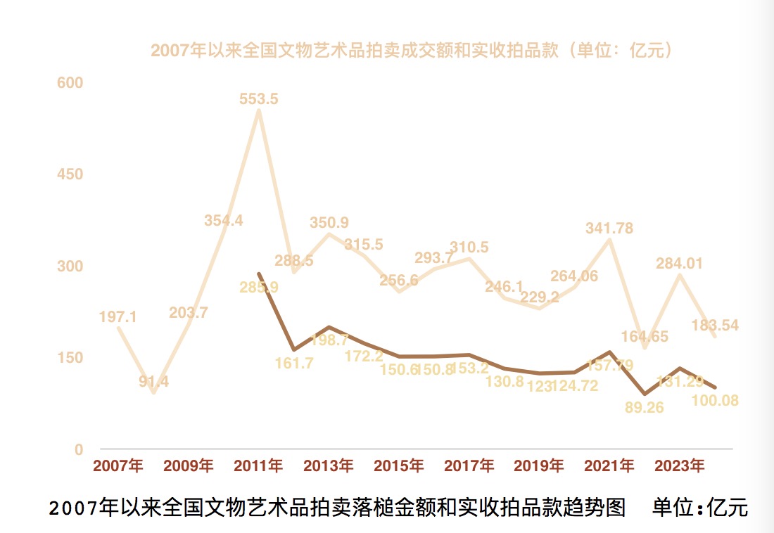 年报显示,2024年,全国文物艺术品拍卖落槌金额为183.54亿元(不含买方佣金),同比下降了35.38%。全年拍卖成交量为30.71万件(套),较上年减少了10.35%。文物艺术品拍卖市场进入深度调整期。截至2025年5月,完成结算100.08亿元(另实收买卖双方佣金15亿元)。