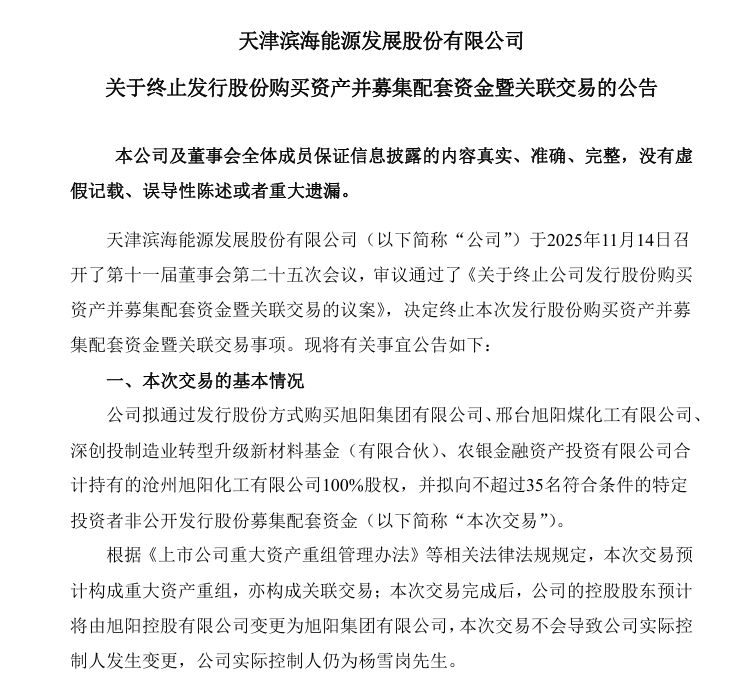 11月14日晚间,滨海能源(000695,股价14.51元,市值32.23亿元)公告称,公司当日召开了第十一届董事会第二十五次会议,审议通过《关于终止公司发行股份购买资产并募集配套资金暨关联交易的议案》,同意终止公司拟通过发行股份方式购买旭阳集团有限公司、邢台旭阳煤化工有限公司、深创投制造业转型升级新材料基金(有限合伙)、农银金融资产投资有限公司合计持有的沧州旭阳化工有限公司100%股权,并拟向不超过35名符合条件的特定投资者非公开发行股份募集配套资金事项。