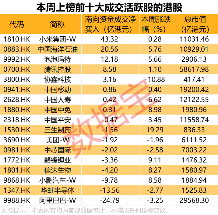 从本周上榜每日前十大活跃个股名单来看,共有17只个股上榜,阿里巴巴-W本周港股通成交总额最高,达到489.19亿港元,中芯国际、腾讯控股港股通买卖总额均超过200亿港元。