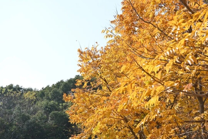 无患子。无患子的果实很多,可以用来当作天然的肥皂,味道十分清新。秋天连叶片带果实都会变成金黄。