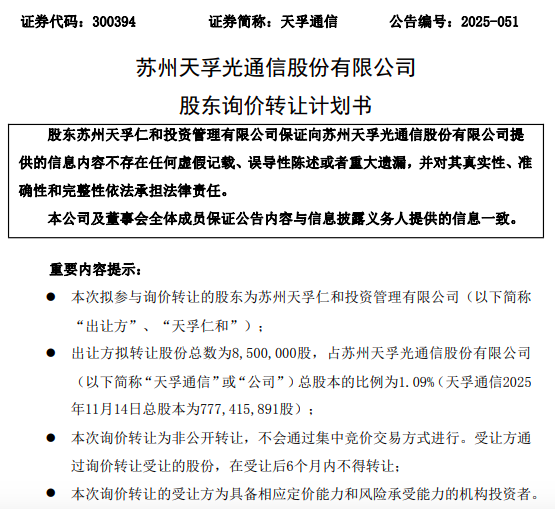 同时,公告称,本次询价转让的价格下限不低于发送认购邀请书之日(即2025年11月14日,含当日)前20个交易日天孚通信股票交易均价的70%。此次询价转让为非公开转让,不会通过集中竞价交易方式进行;受让方通过询价转让受让的股份,在受让后6个月内不得转让。