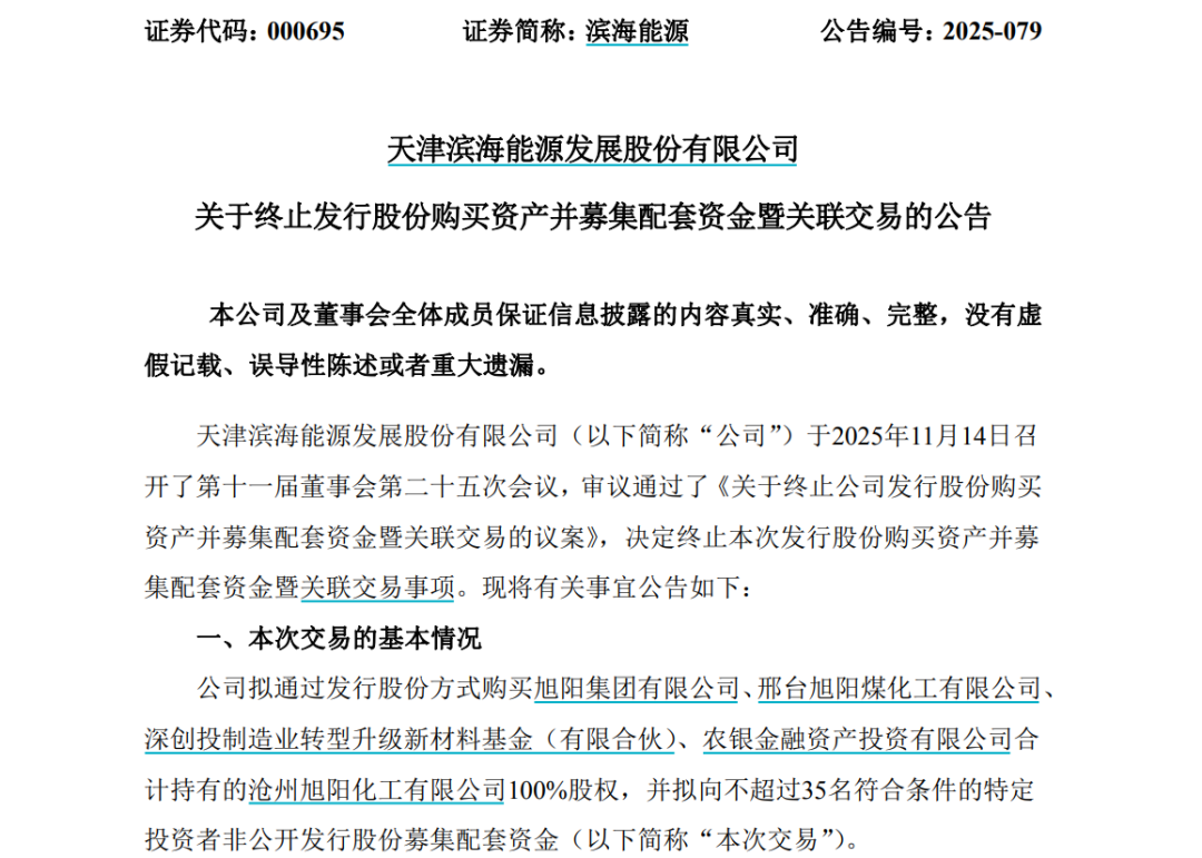 11月14日,滨海能源发布公告称,公司原拟通过发行股份方式购买旭阳集团有限公司、邢台旭阳煤化工有限公司、深创投制造业转型升级新材料基金(有限合伙)、农银金融资产投资有限公司合计持有的沧州旭阳化工有限公司(以下简称沧州旭阳)100%股权,并拟向不超过35名符合条件的特定投资者非公开发行股份募集配套资金。