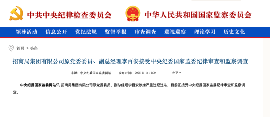 招商局集团有限公司原党委委员、副总经理李百安接受中央纪委国家监委纪律审查和监察调查。