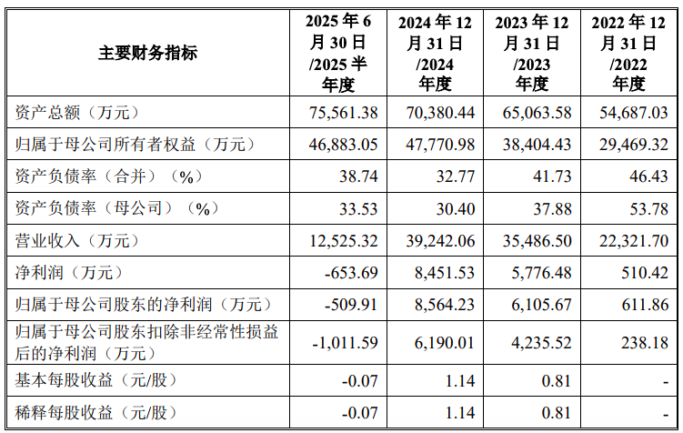 业绩方面,据招股书(上会稿),2022年至2025年1~6月(以下称报告期内)公司营收与净利润均实现快速增长。报告期内,公司营业收入分别为2.23亿元、3.55亿元和3.92亿元和 1.25亿元,其中2022年~2024年复合增长率为32.59%, 2025年1~6月同比增长13.01%;净利润分别为 510.42万元、5776.48万元、 8451.53万元和-653.69万元,其中2022 年~2024年复合增长率为306.92%。