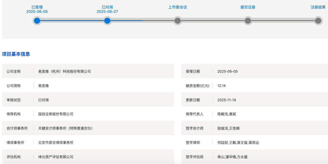 上交所11月14日公告称,上市委将于2025年11月21日审议易思维(杭州)科技股份有限公司(以下简称“易思维”或“公司”)科创板IPO项目。