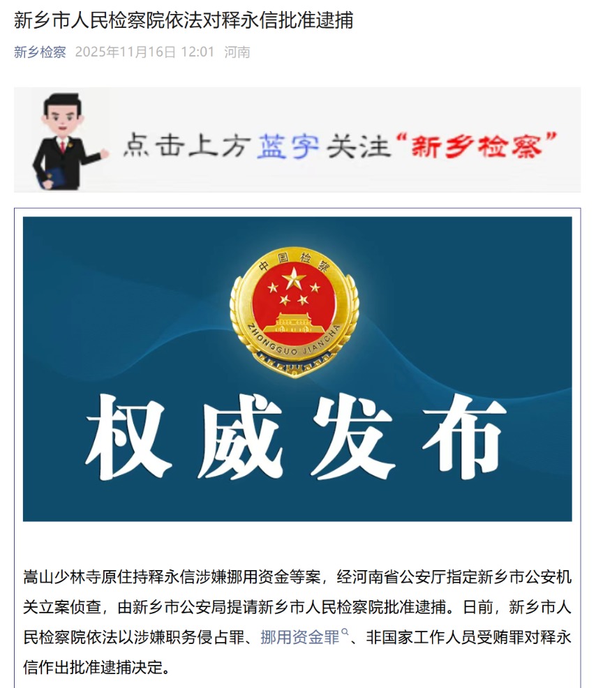 11月16日,“新乡检察”官微消息显示,新乡市人民检察院依法对释永信批准逮捕。