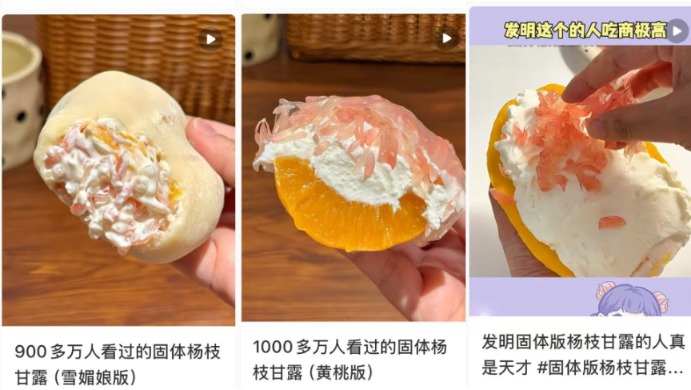 “固体杨枝甘露”热销,已成为全行业跟进的热门话题。数据显示,相关话题在抖音平台的播放量已超6亿次,更在短时间内衍生出2.0、3.0版本,以及雪媚娘版、黄桃版等“邪修”吃法。