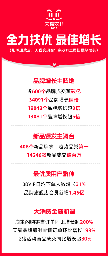 今年以来,天猫提出全力扶持优质品牌和原创商家,投入战略级资源做大品牌增长。2025年天猫“双11”,天猫实现了四年来“双11”全周期最好的一次增长。天猫始终是优质品牌商家的增长主阵地,天猫“双11”始终是优质品牌商家全年最重要的增长机会。