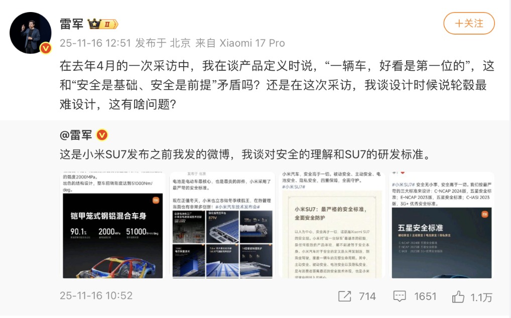 在原采访视频中,雷军曾表示“一辆车好看是第一位的”,随后被指为“小米汽车重颜值轻安全”,质疑其忽视安全标准。在11月16日的微博网友评论下面,雷军称,“网上有不少人断章取义,歪曲抹黑”。