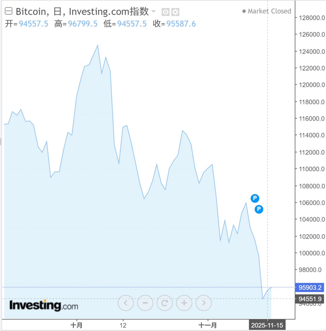 11月16日早间,比特币直线跳水,盘中从10万美元附近直线跌破95000美元大关。