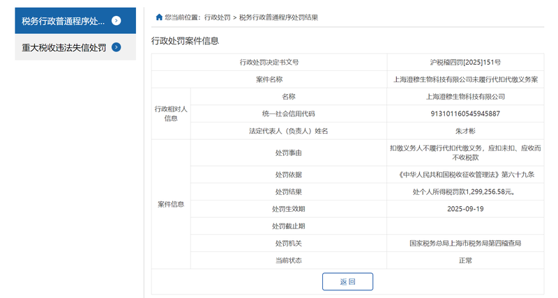 据国家税务总局上海市税务局行政执法信息公示平台,今年9月19日,澄穆生物因税务问题被行政处罚,行政处罚决定书文号为沪税稽四罚[2025]151号。