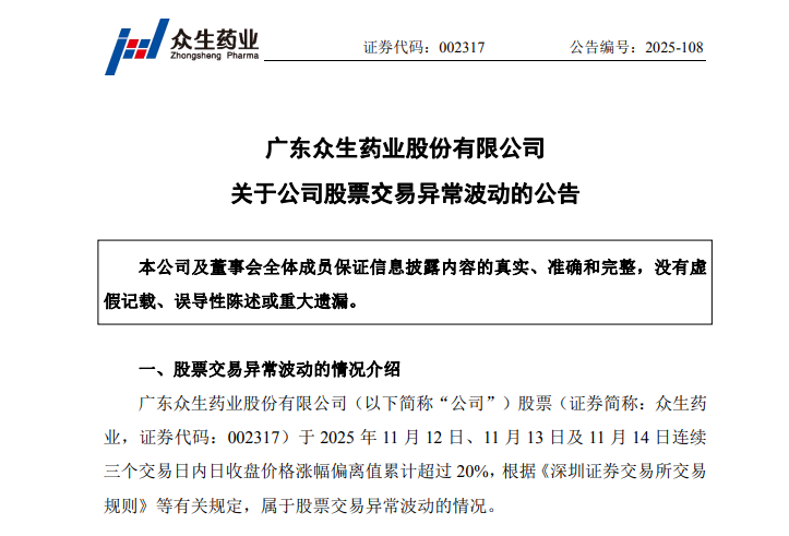 在股价连续大涨背景下,众生药业11月16日发布公司股票交易异常波动公告称,目前,公司正在推进昂拉地韦颗粒治疗2~11岁儿童单纯性甲型流感患者和昂拉地韦片治疗12~17岁青少年单纯性甲型流感患者的两项III期临床试验、RAY1225注射液治疗肥胖/超重患者的III期临床试验以及RAY1225注射液治疗2型糖尿病患者的两项III期临床试验。创新药研发项目的临床试验进度、审评和审批的结果以及未来产品市场竞争格局都具有一定的不确定性。药品能否获批上市以及获批上市的时间、上市后的生产和销售情况存在不确定性。