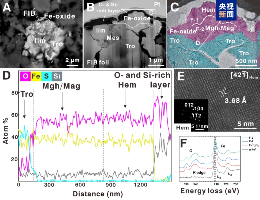 研究提出,赤铁矿的形成可能与月球历史上的大型撞击事件密切相关。大型撞击形成瞬时高氧逸度气相环境的同时,铁元素在高氧逸度环境中被氧化,使陨硫铁发生了脱硫反应,经气相沉积过程形成微米级晶质赤铁矿颗粒。值得关注的是,该反应的中间产物为具有磁性的磁铁矿和磁赤铁矿,可能是南极-艾特肯盆地边缘磁异常的矿物载体。该研究首次利用样品证实了在超还原背景下月球表面存在赤铁矿等强氧化性物质,揭示了月球的氧化还原状态以及磁异常成因。