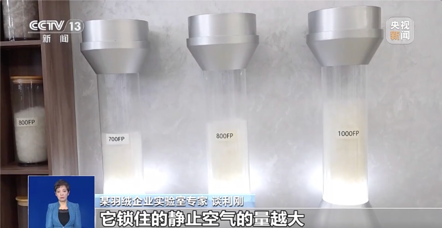 此外,消费者买羽绒服普遍还关注“蓬松度”,如700蓬、800蓬,这指的是30克羽绒在标准压力下的体积。700蓬是指30克的羽绒在一定的压力下,体积为700立方英寸,800蓬就是800立方英寸。蓬松度越高,羽绒锁住的静止空气的量越大,衣服的保暖性能也就相对越好。