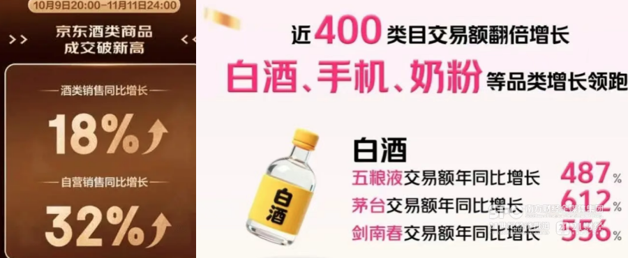 京东发布的11.11战报显示,10月9日20点~11月11日24点,酒类销售同比增长18%,其中自营酒类销售成交额同比增长32%。