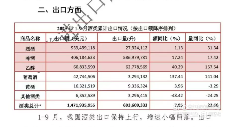 前三季度白酒出口量同比增长31% 进口酒继续下行