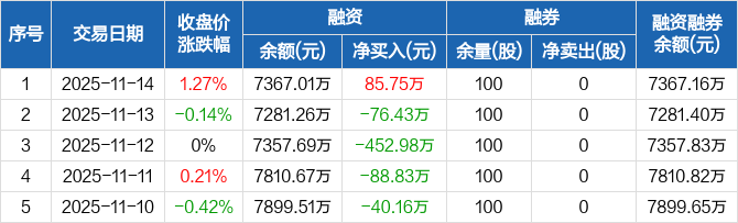 融资方面,当日融资买入547.57万元,融资偿还461.82万元,融资净买入85.75万元。融券方面,融券卖出0股,融券偿还0股,融券余量100股,融券余额1433元。融资融券余额合计7367.16万元。