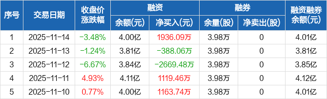 融资方面,当日融资买入6240.26万元,融资偿还4304.17万元,融资净买入1936.09万元。融券方面,融券卖出0股,融券偿还0股,融券余量3.98万股,融券余额82.86万元。融资融券余额合计4.01亿元。