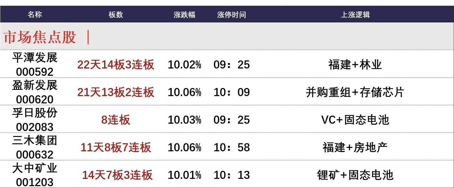 今日午盘全市场共67股涨停,连板股总数23只,22股封板未遂,封板率为75%(不含ST股、退市股)。焦点股方面,福建本地股反复活跃,平潭发展22天14板,三木集团11天8板;锂电池板块延续强势,孚日股份8连板,大中矿业 14天7板。
