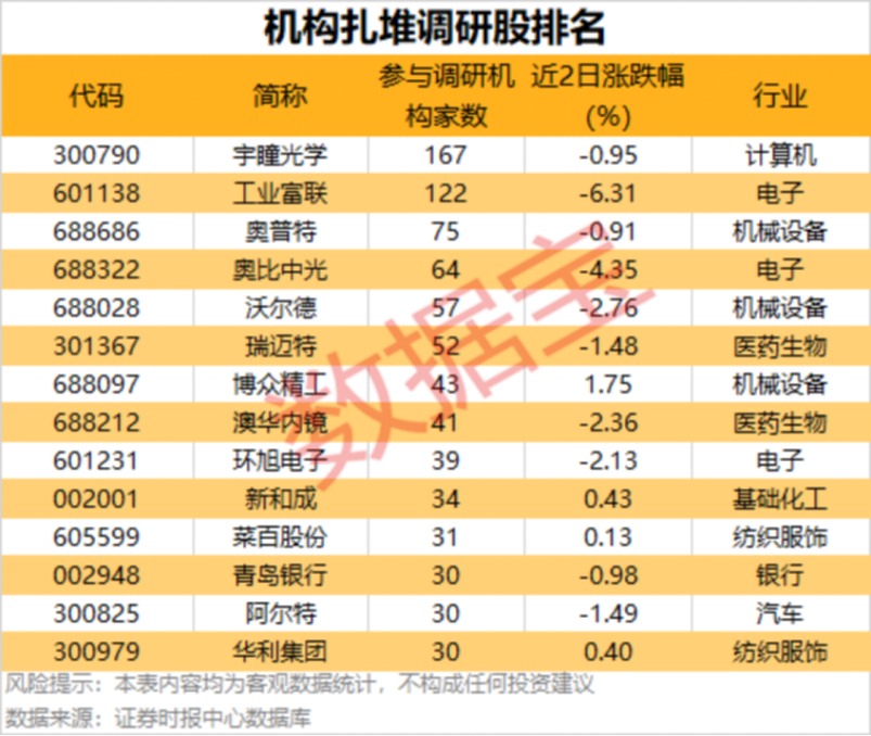 近两个交易日(11月13日至11月14日)共有107家公司公告机构调研记录,其中,6家公司有50家以上机构扎堆调研,宇瞳光学、工业富联较受关注,分别有167家、122家机构调研。