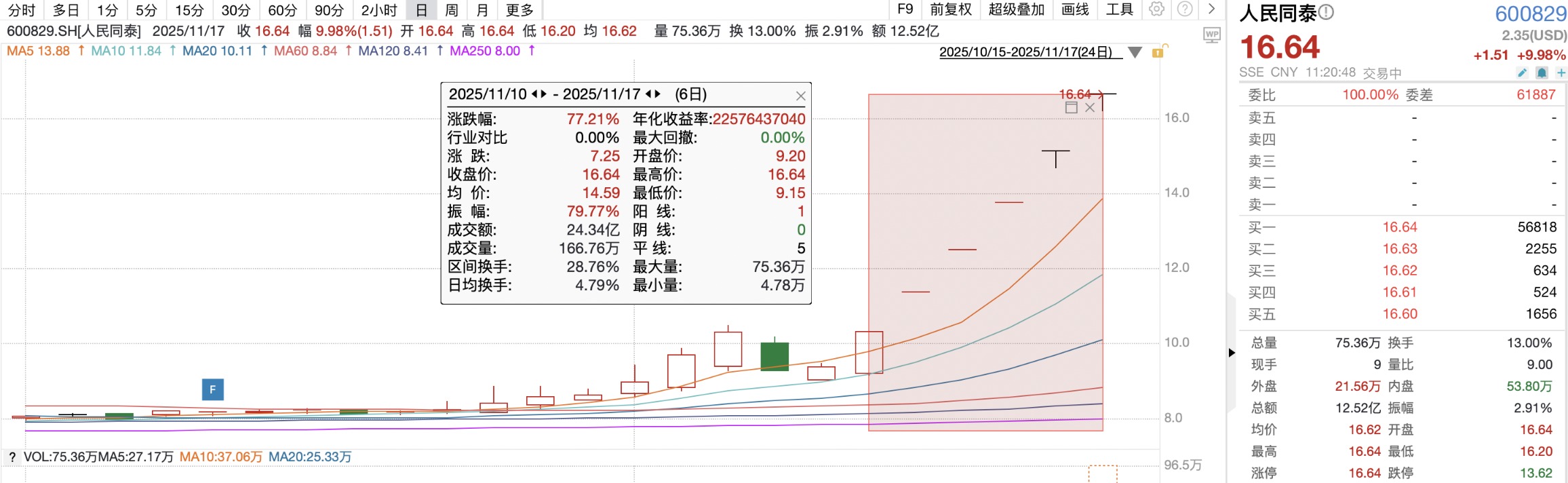 Wind数据显示,截至11月17日午间收盘,人民同泰已连续6个交易日涨停,公司股价从11月10日的9.20元/股一路飙升至11月17日的16.64元/股,累计涨幅高达77.21%,总市值达到96亿元。
