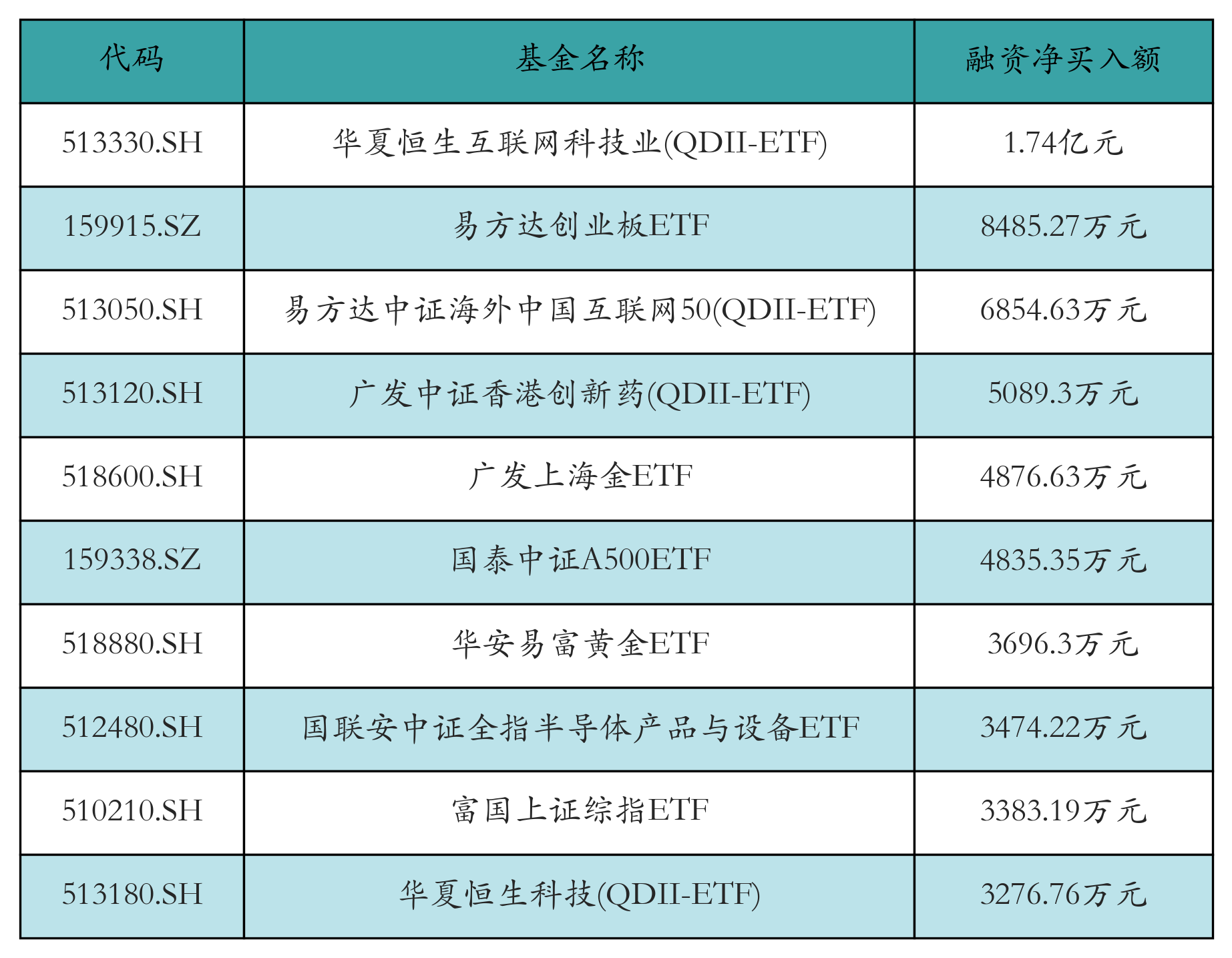 11月14日ETF融资净买入额前三位分别为:华夏恒生互联网科技业(QDII-ETF)(1.74亿元)、易方达创业板ETF(8485.27万元)和易方达中证海外中国互联网50(QDII-ETF)(6854.63万元),前10具体见下表: