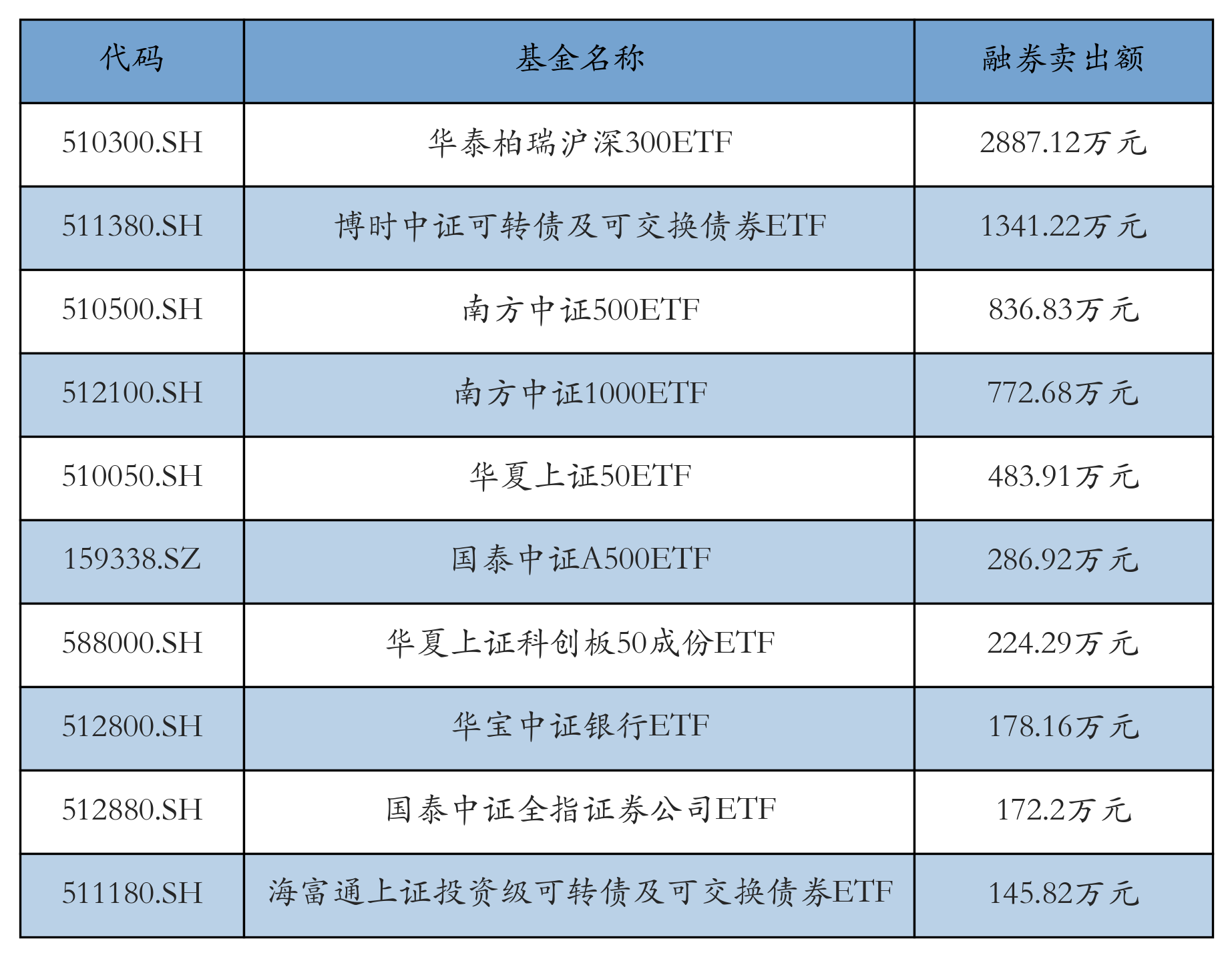 11月14日ETF融券卖出额前三位分别为:华泰柏瑞沪深300ETF(2887.12万元)、博时中证可转债及可交换债券ETF(1341.22万元)和南方中证500ETF(836.83万元),前10具体见下表:
