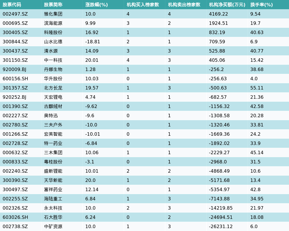 南财智讯11月17日电,南财金融终端数据显示,因当日异动登上龙虎榜的个股中,24只沪深A股龙虎榜出现了机构的身影,机构合计净卖出93358.09万元,具体来看,机构净买入6只个股,净卖出18只个股。其中,机构净买入前三分别为雅化集团(002497.SZ)、滨海能源(000695.SZ)与科隆股份(300405.SZ),详情见下图:机构净卖出的个股中,前三分别为中矿资源(002738.SZ)、石大胜华(603026.SH)与永太科技(002326.SZ)。