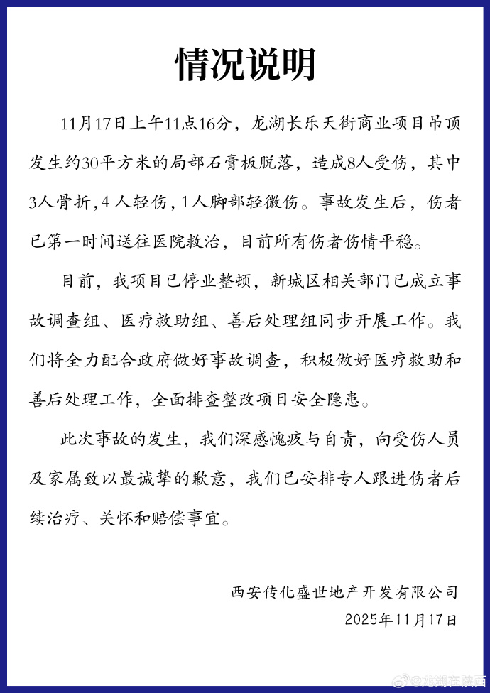 西安龙湖地产发展有限公司官方账号发布情况说明并致歉:11月17日上午11点16分,龙湖长乐天街商业项目吊顶发生约30平方米的局部石膏板脱落,造成8人受伤,其中3人骨折,4人轻伤,1人脚部轻微伤。