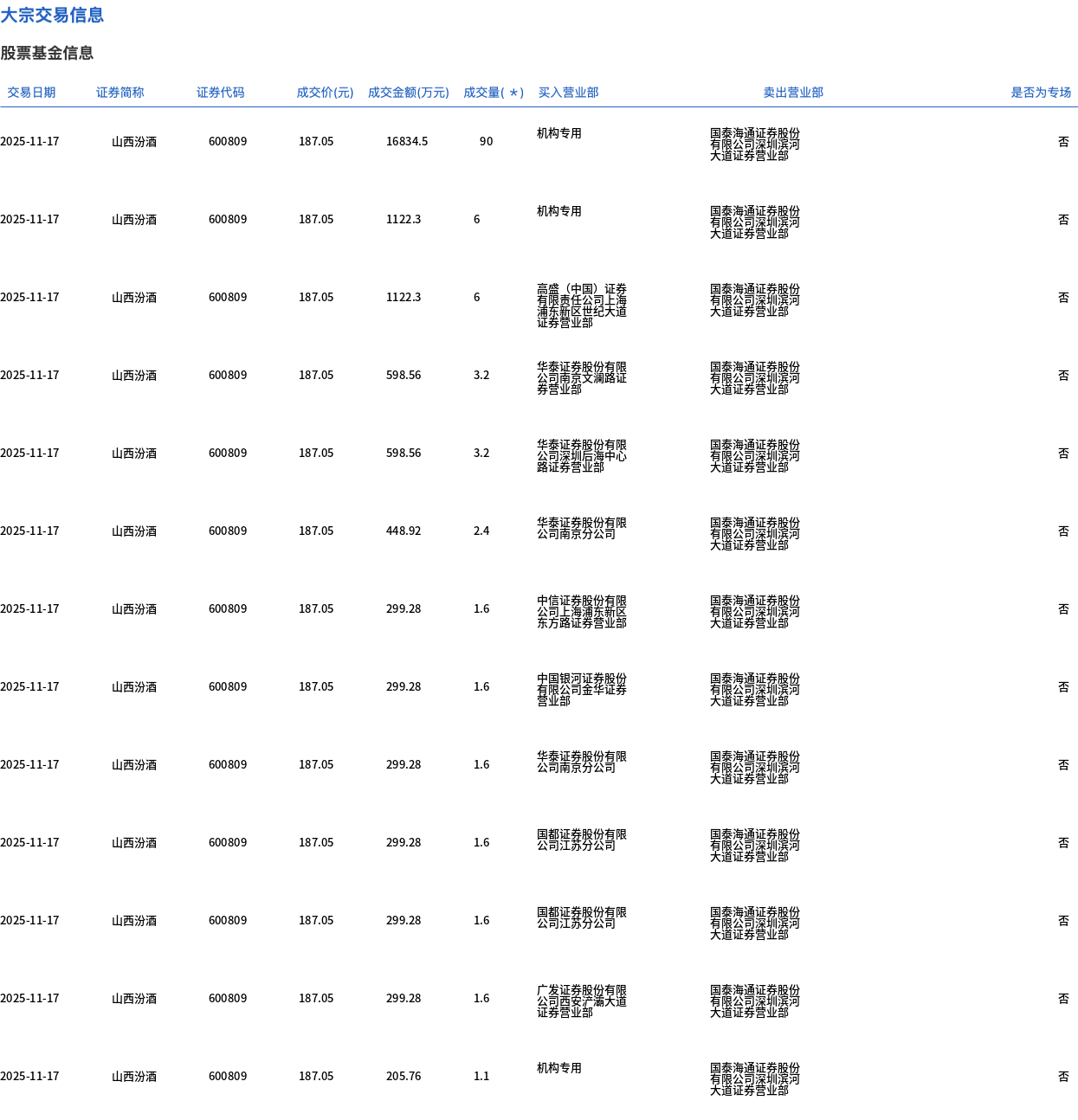 山西汾酒今日大宗交易折价成交121.5万股,成交额2.27亿元
