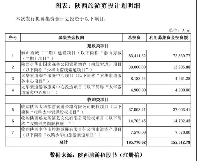 招股书显示,陕西旅游拟募资15.55亿元,其中用7.29亿元投建泰山秀城二期项目,1.39亿元投建少华山南线索道项目。