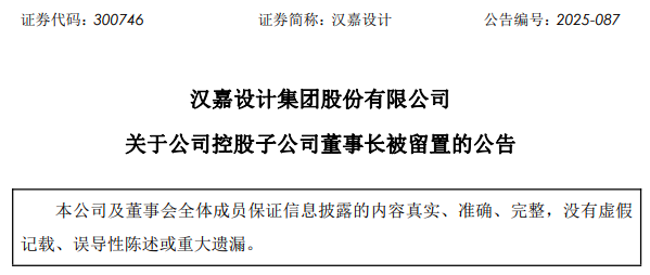 汉嘉设计:控股子公司董事长沈刚被立案调查并实施留置