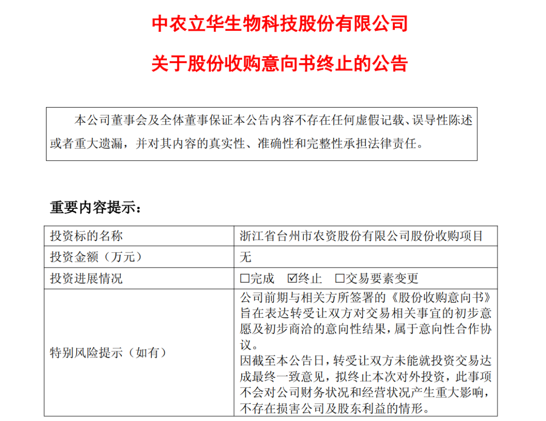 中农立华表示,《股份收购意向书》签署后,双方依照协议规定积极推动相关工作的实施。在尽职调查和资产评估的基础上,公司与陶维康先生等自然人股东就本次交易涉及的相关事项进行了多次讨论协商,但现阶段双方未能就本次交易的部分核心条款达成最终一致意见。