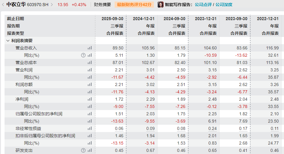 业绩方面,中农立华前三季度只增收不增利。中农立华三季报显示,公司前三季度实现营业收入89.5亿元,同比增长5.11%;归属于母公司所有者的净利润为1.51亿元,同比下降13.63%。