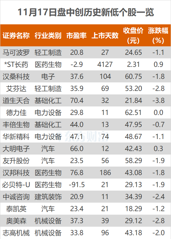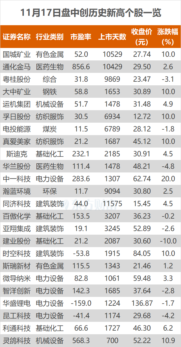 11月17日,A股三大指数今日集体回调,截止收盘,沪指跌0.46%,收报3972.03点;深证成指跌0.11%,收报13202.00点;创业板指跌0.20%,收报3105.20点。东方财富Choice数据显示,今日有24只个股盘中股价创历史新高,分别为孚日股份、大中矿业等。