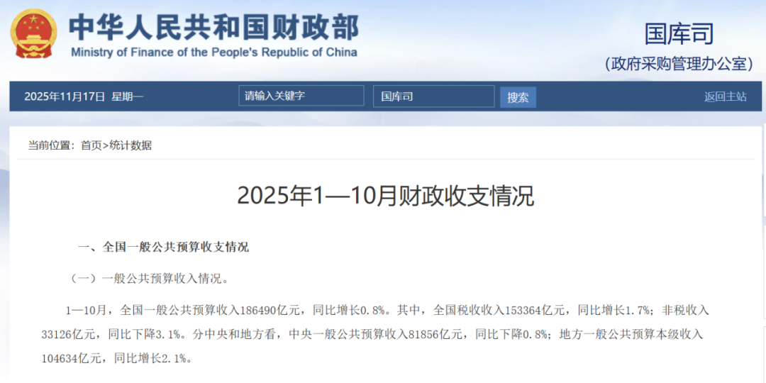11月17日,财政部公布的2025年1—10月财政收支情况显示,前10个月全国一般公共预算收入增幅稳步回升,财政支出增幅放缓,但民生相关支出依然维持较高增幅。10月份,全国一般公共预算收入增幅继续提高,税收收入延续较快增长。