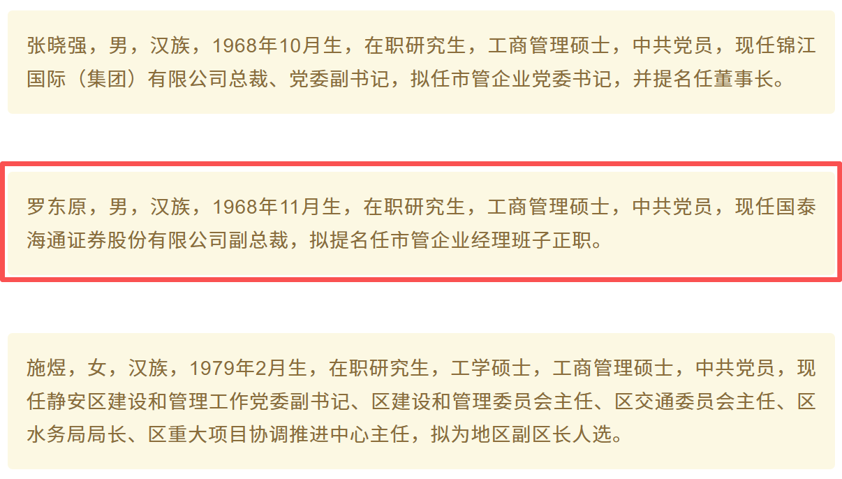 公示信息显示,罗东原,男,汉族,1968年11月生,在职研究生,工商管理硕士,中共党员,现任国泰海通证券股份有限公司副总裁,拟提名任市管企业经理班子正职。