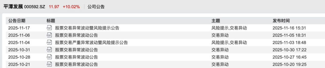 11月17日晚间,平潭发展公告称,公司股票自2025年10月17日至11月17日价格涨幅达255.19%,其间于10月20日、10月27日、10月30日、11月3日、11月5日、11月14日6次触及股票交易异常波动情形,并于11月3日1次触及股票交易严重异常波动情形。