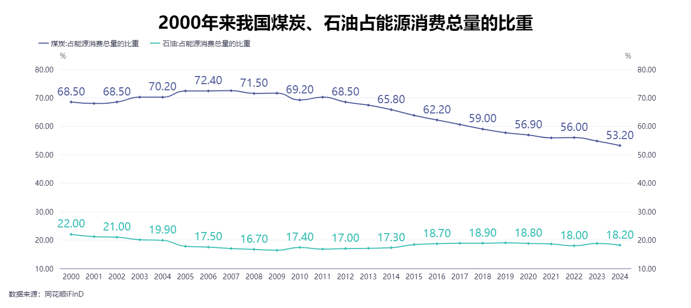 黄少中:数据显示,我国煤炭消费占能源消费的比重已经从2000年的68.5%下降到2024年的53.2%,石油从22%下降到18.2%,但二者之和仍占据我国能源消费的71.4%,而且二者的消费总量和产量还在增加。