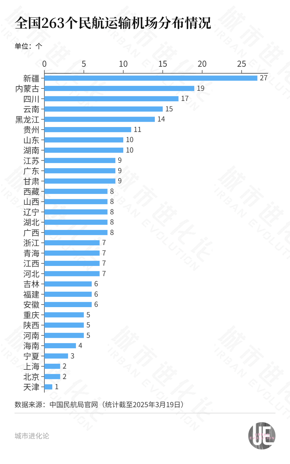解读:相比密集的铁路网络,河南的航空布局要显得滞后一些。中国民航局的数据显示,截至2025年3月,全国境内运输机场共有263个,其中新疆以27个民用运输机场数量居首,内蒙古(19个)和四川(17个)分居第二、三位。