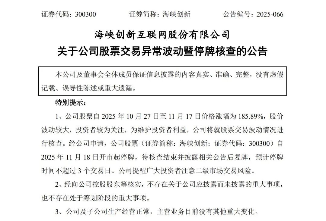 同日,海峡创新公告称,公司股票自10月27日至11月17日价格涨幅为185.89%,为维护投资者利益,公司将就股票交易波动情况进行核查。经公司申请,公司股票自2025年11月18日开市起停牌,待核查结束并披露相关公告后复牌,预计停牌时间不超过3个交易日。公司目前经营情况正常,内外部经营环境未发生重大变化,前期披露的信息不存在需要更正、补充之处。