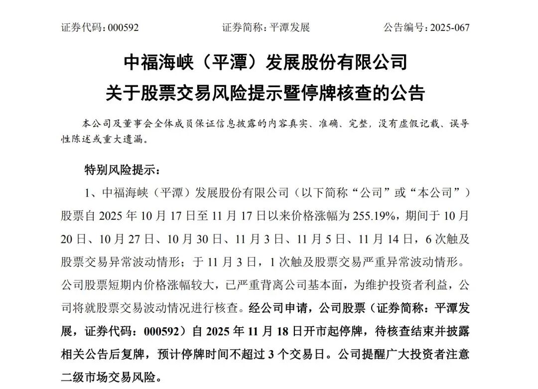 平潭发展晚间公告显示,公司股票自2025年10月17日至11月17日以来价格涨幅为255.19%,期间6次触及股票交易异常波动情形,1次触及股票交易严重异常波动情形。公司股票短期内价格涨幅较大,已严重背离公司基本面,为维护投资者利益,公司将就股票交易波动情况进行核查。经公司申请,公司股票自2025年11月18日开市起停牌,待核查结束并披露相关公告后复牌,预计停牌时间不超过3个交易日。平潭发展称,公司主营业务未发生重大变化,股价短期内连续上涨,存在市场情绪过热、非理性炒作风险。