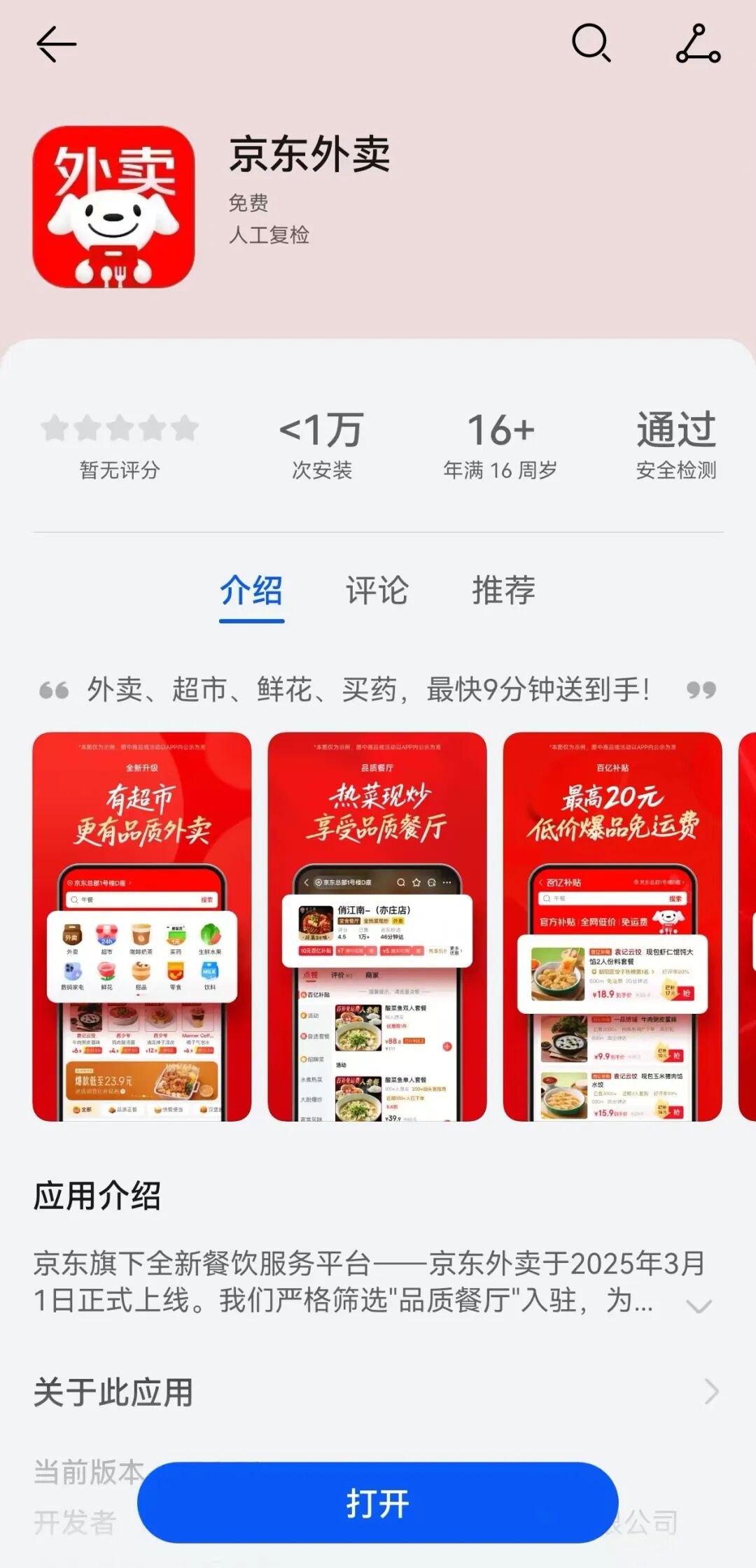 11月17日21时许,上海证券报记者通过手机应用商店搜索并下载到京东外卖App,打开后可见定位附近的餐饮商家。页面显示,目前小于1万次安装。