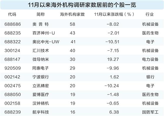 从行情来看,海外机构调研公司11月以来股价平均涨幅为0.99%,45家公司股价实现上涨,华盛锂电、苏州天脉和普冉股份涨幅居前,分别上涨184.61%、34.04%和22.97%。