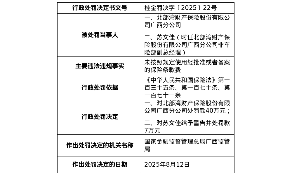 针对以上问题,国家金融监督管理总局广西监管分局对其处以罚款40万元。同时,时任北部湾财产保险股份有限公司广西分公司非车险部副总经理苏文佳,被给予警告并处罚款7万元。