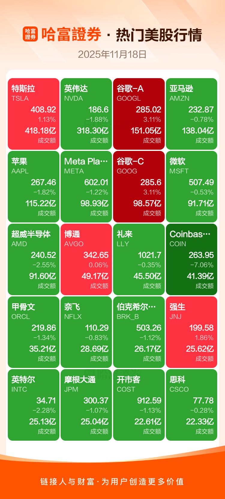 特斯拉涨1.13%,英伟达跌1.88%,谷歌-A涨3.11%,亚马逊跌0.78%,苹果跌1.82%,Meta Platforms Inc-A跌1.22%,谷歌-C涨3.11%,微软跌0.53%,超威半导体跌2.55%,博通涨0.06%。